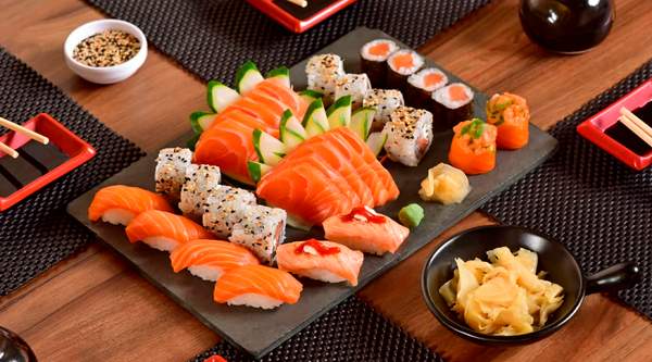 2 Sushi salmón, 1 sushi atún, 3 sushi pescado blanco variado, 4 California roll, 4 maki atún y 4 aguacate roll