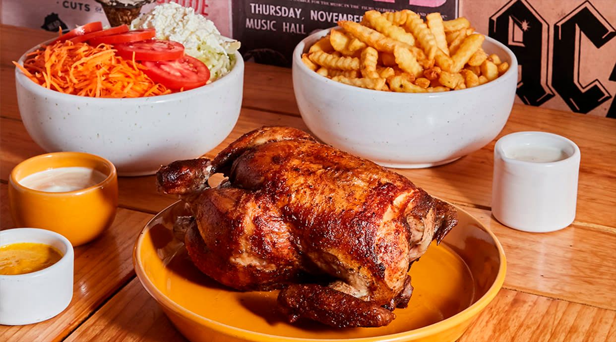 1 Pollo asado, 1/2 patatas al ajillo, 1 ensalada pequeña, 2 bebidas, 1 alioli