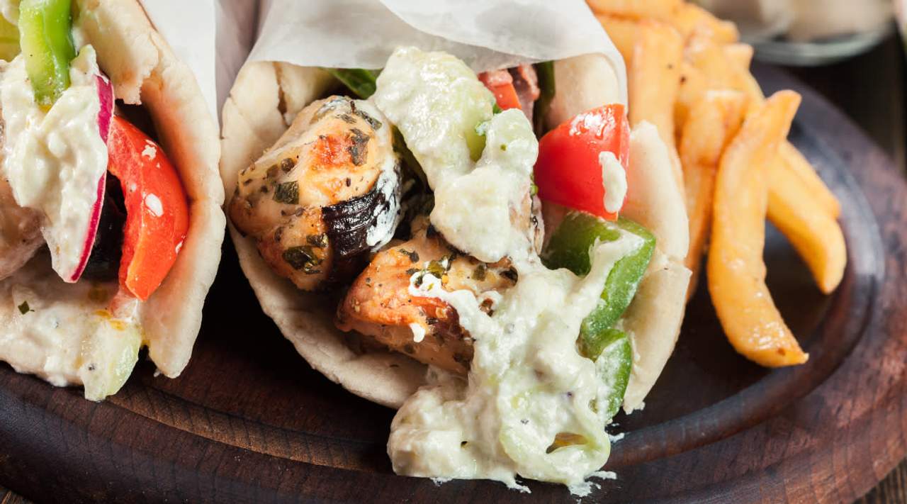 Pita rellena de carne de pollo o de cerdo, patatas fritas, tomate y tzatziki