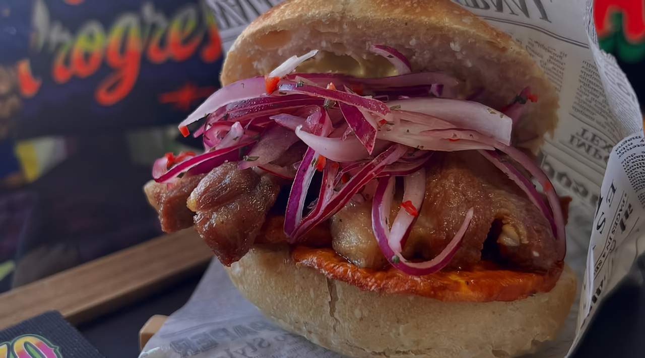 Nuestra estrella de la casa compuesto de un pan francés, panceta crocante, camote frito, sarsa criolla y crema de ají amarillo o rocoto