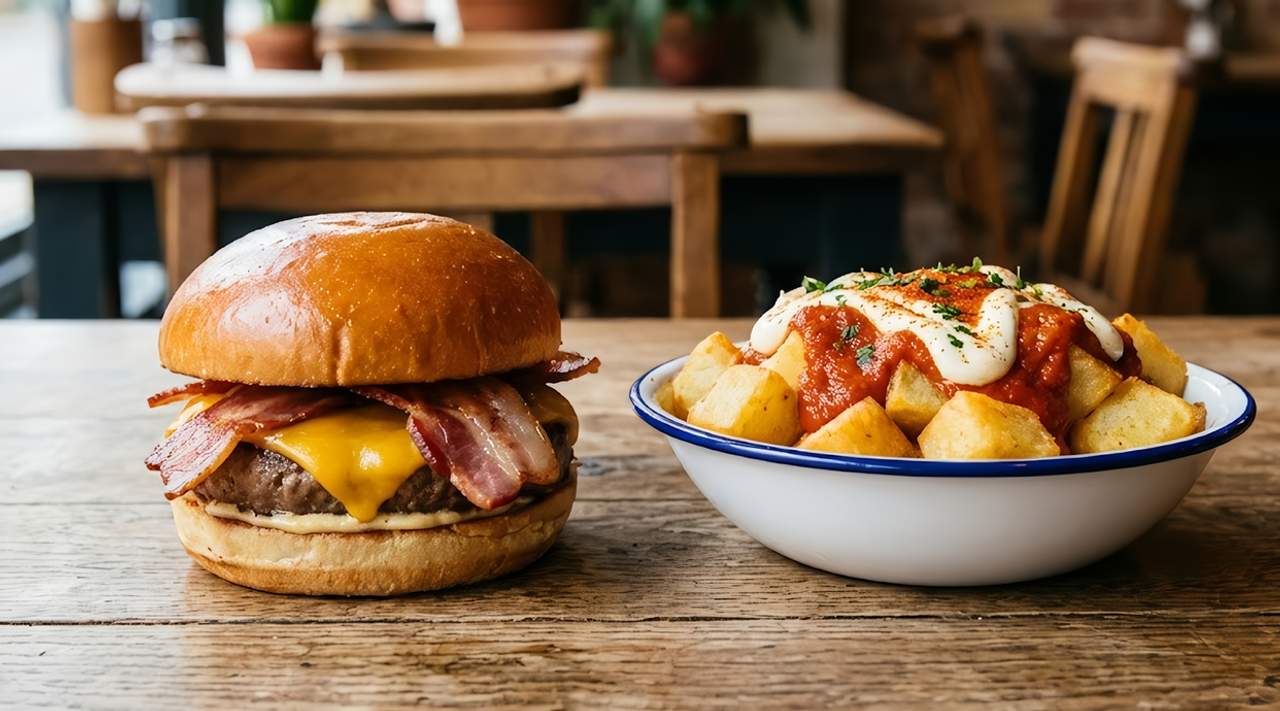 Hamburguesa de buey, lechuga, tomate, salsa de yogur, cebolla crujiente, bacon, queso, pepino laminado y patatas.