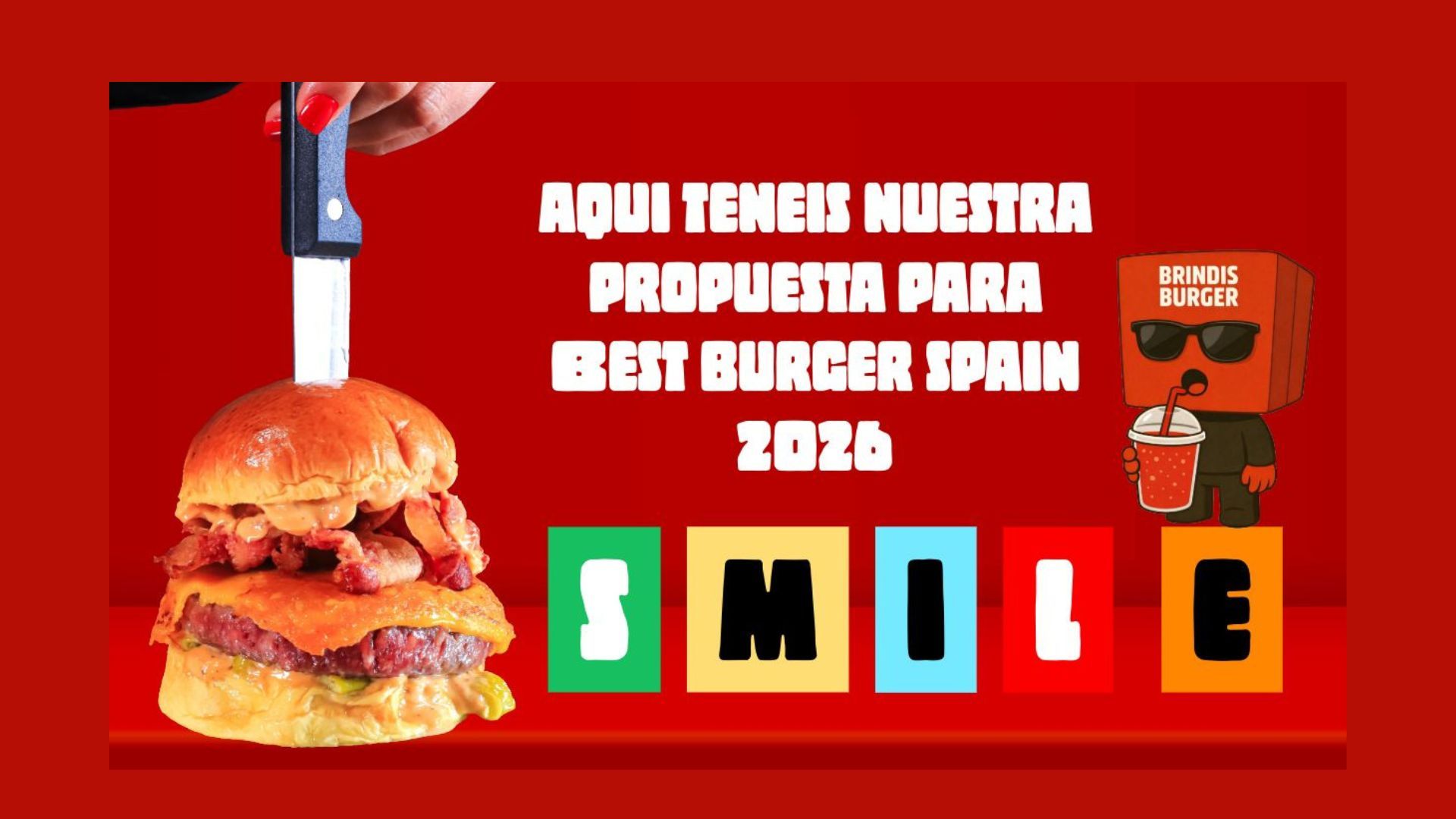 Doble ternera al estilo smash en pan potato roll, doble queso, bacon, salsa especial brindis y cebolla frita.