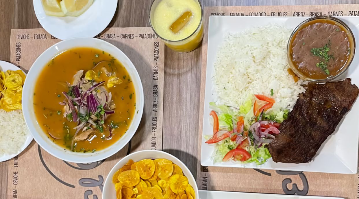 Caldo costeño de bonito y langostinos, con yuca y cebolla encurtida. Acompañado de chifles