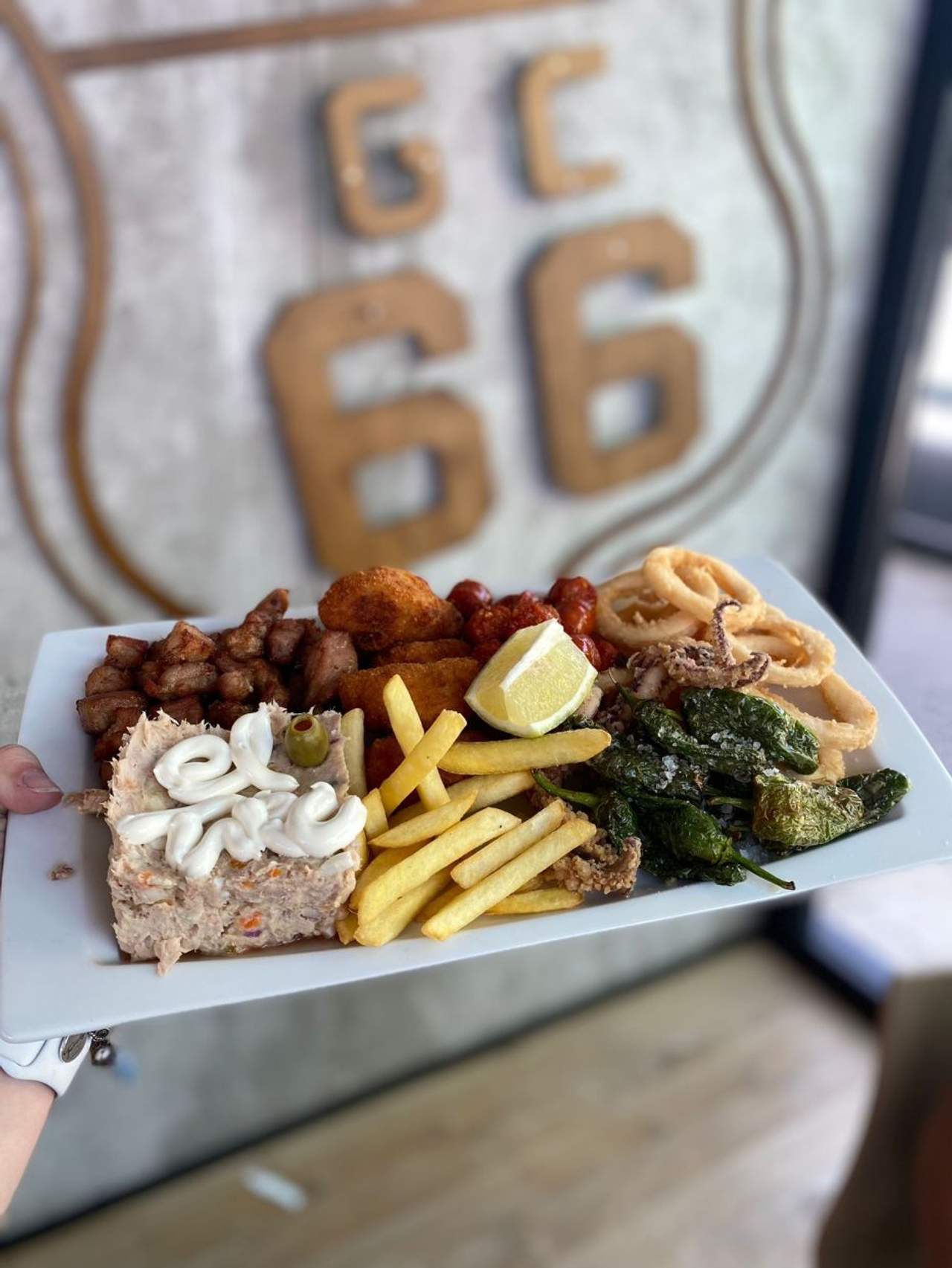 Carne de cochino, pimientos padrón, calamares, chistorra, croquetas de pollo, ensalada rusa y papas.