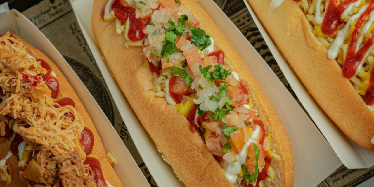 Pan artesanal, salchichas maxi, patatas pajas, ó cebollas crujientes Salsas a elegir. Ketchup, mayonesa, mostaza, salsa de ajo perejil, bacon, maiz, tártara, cheddal