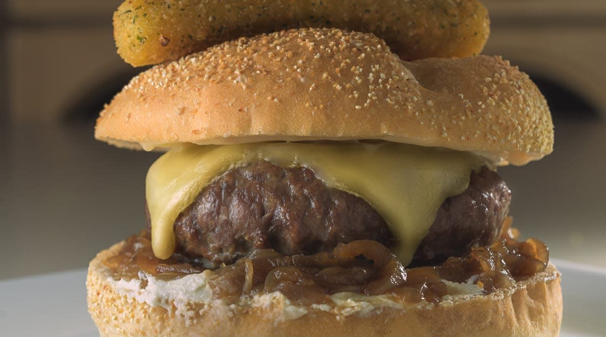 Hamburguesa de ternera de La Finca (160 g.) a la parrilla con cabrales en crema, queso Raclette, finger de mozzarella, cebolla caramelizada y emulsión de membrillo