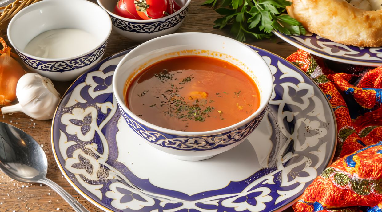 Sopa agria y cremosa hecha con callos de ternera (estómago), ajo, yemas de huevo, nata agria y vinagre, servida a menudo con guindilla