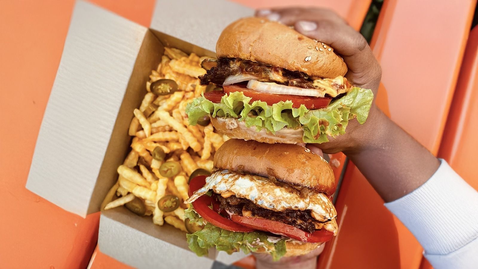 საქონლის ხორცი, კვერცხი, სალათის ფოთოლი, პომიდორი, ჭარხალი, კარამელიზებული ხახვი, ჩედარის ყველი, ბურგერის სოუსი.