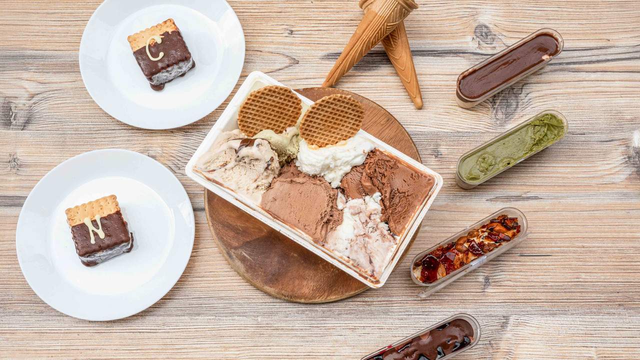 Biscotto con gelato al pistacchio ricoperto di cioccolato croccante.