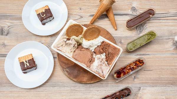 Biscotto con gelato alla nocciola, ricoperto di cioccolato