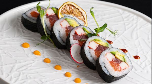 Roll di riso farciti con surimi di granchio, avocado e tobiko