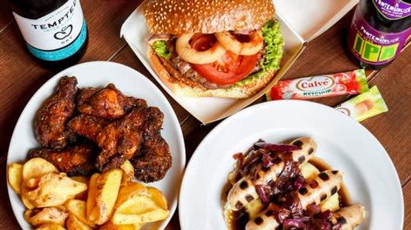 Un mix di piatti dalla cucina dello Shamrock da condividere tra 4 persone con 4 mini-hamburger, patate fritte, wurstel, ali di pollo e onion rings