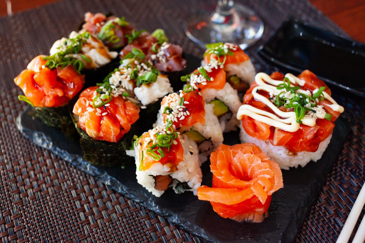 Gambero in tempura, formaggio spalmabile avocado con salmone all'esterno e salsa teriyaki