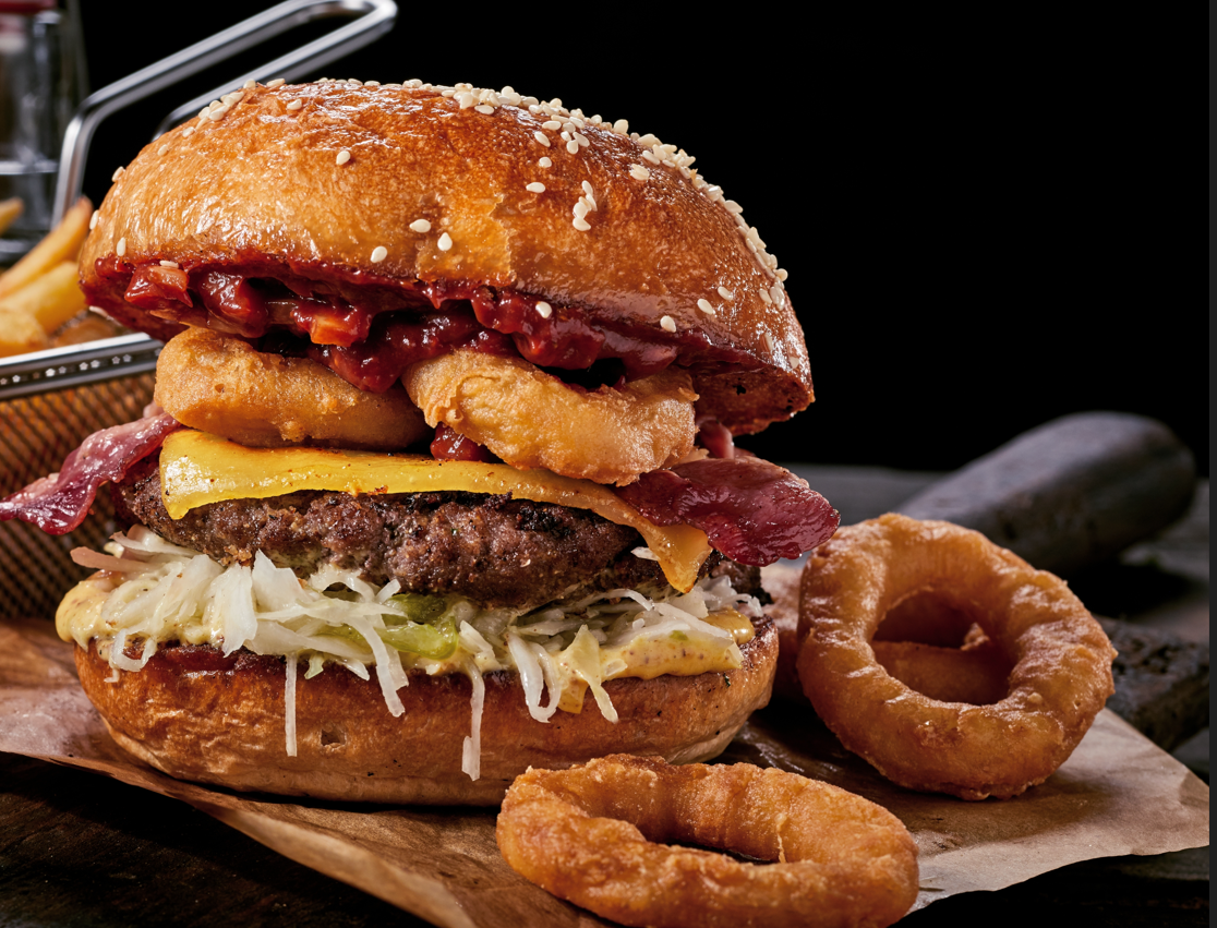 Bun, Doppio hamburger di vitello, cipolla caramellata, pomodoro, lattuga, cheddar, bacon, salsa a scelta