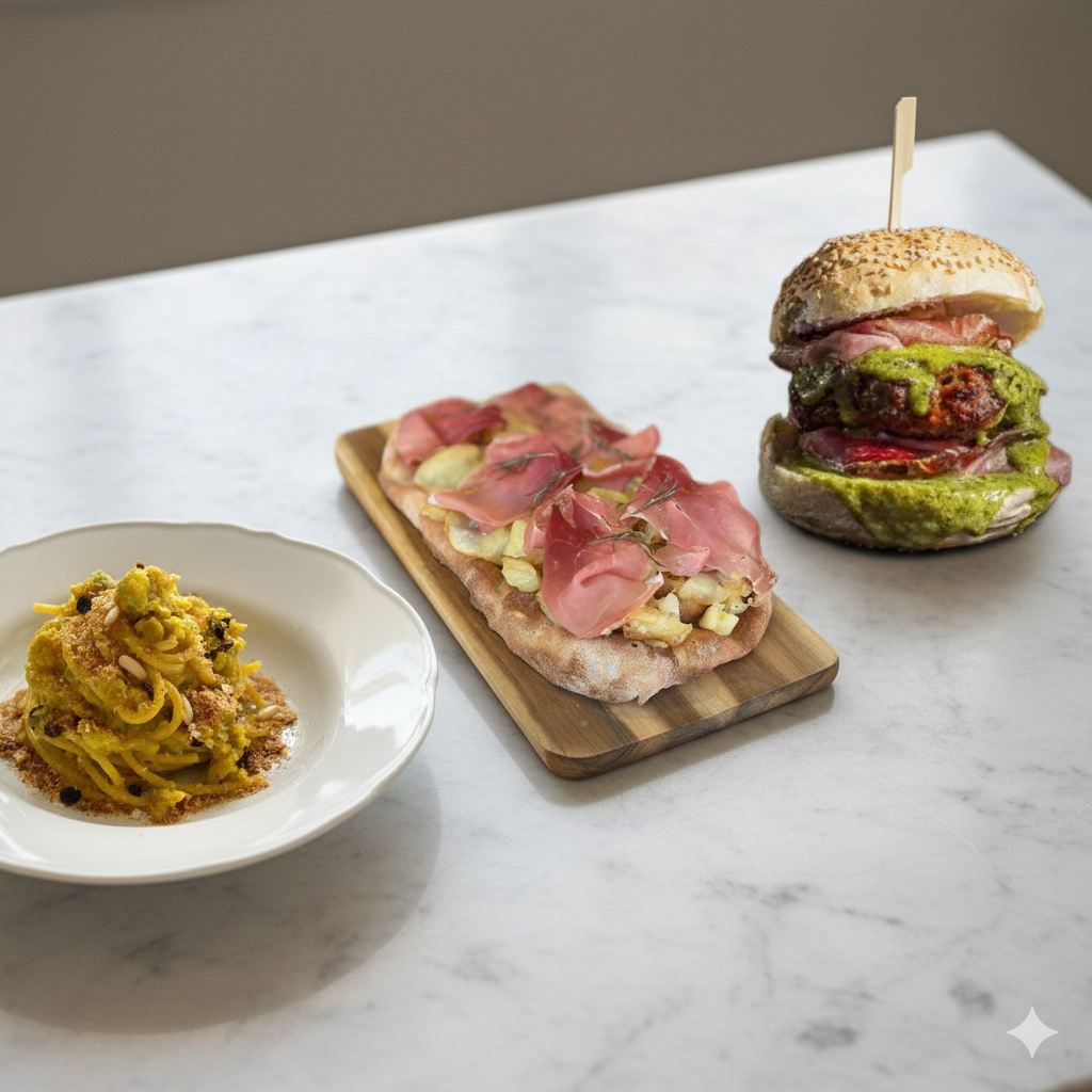 Mozzarella fior di latte La Tramontino, Pesto di pistacchio siciliano, mortadella d'asina al piatacchio, miele e granella di piatacchio siciliano