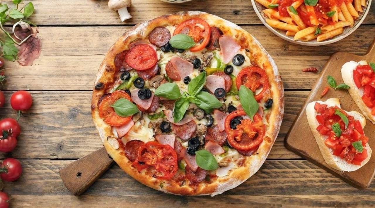 помидоры, колбаса, сыр Моцарелла, красный соус