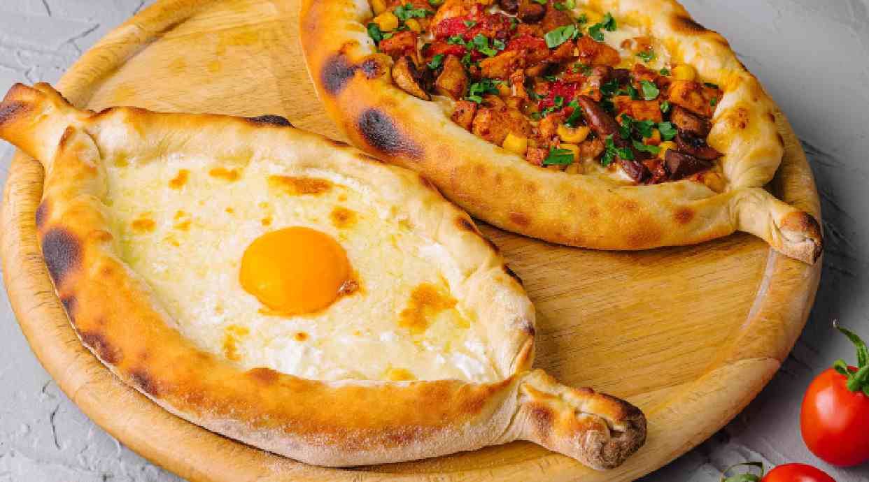 Классический открытый хачапури в виде лодочки,с сыром сулугуни,брынзой и куриным желтком