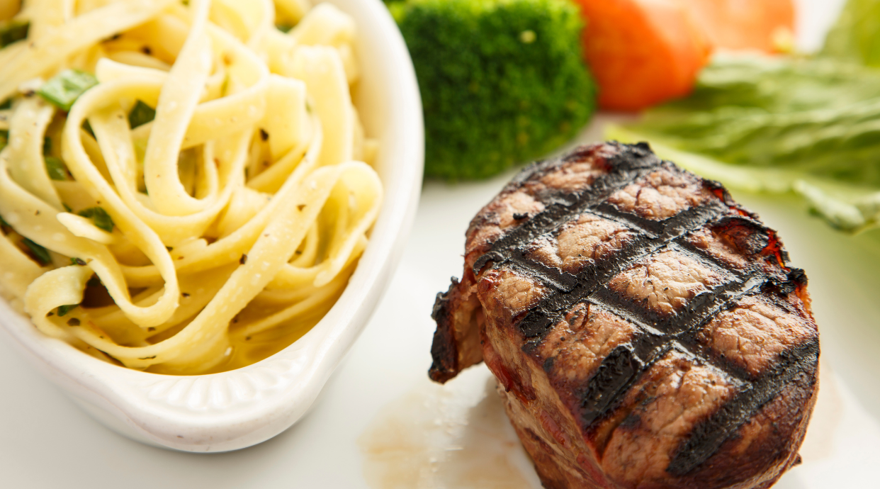 Escalope de poulet pané, servi avec des spaghettis Romana