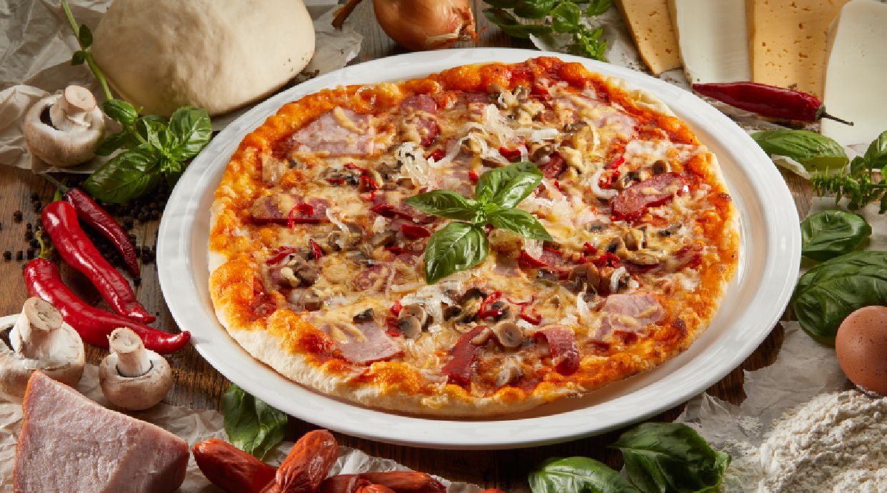 Sauce tomate, fromage, fruits de mer, thon, poulet, viande hachée, origan