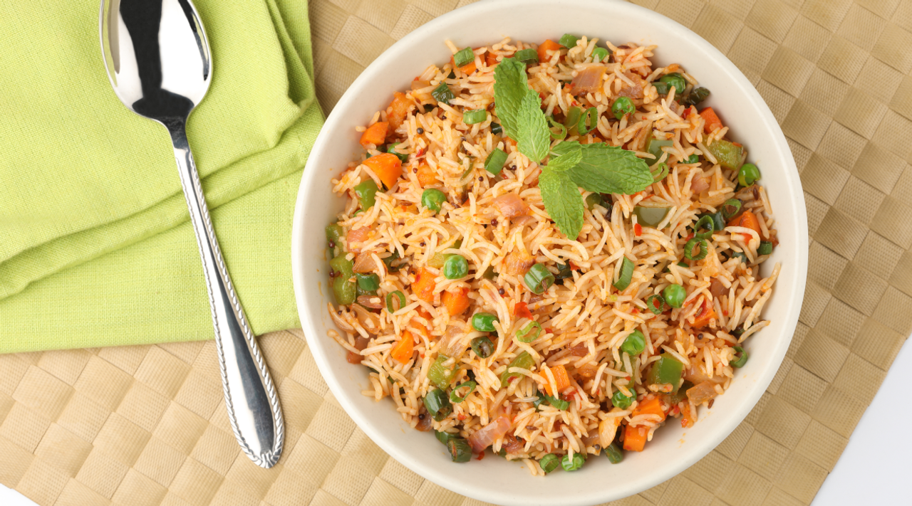 Rice stir fried in a pan with veggie mix, fried rice spices and seasonings, served per portion