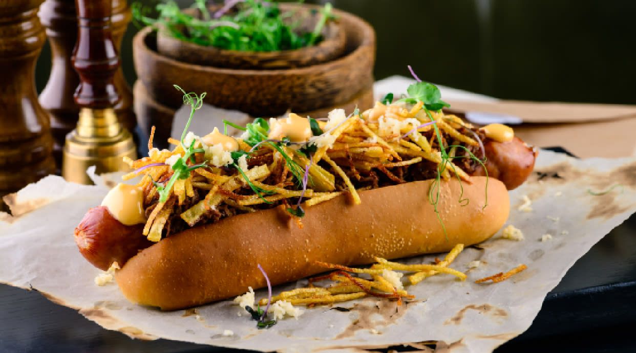 bułka brioche, złocisty kurczak, chrupiący bekon, pomidor, czerwona cebula, hot pikle, sałata, sos amerykański, salsa rosa.