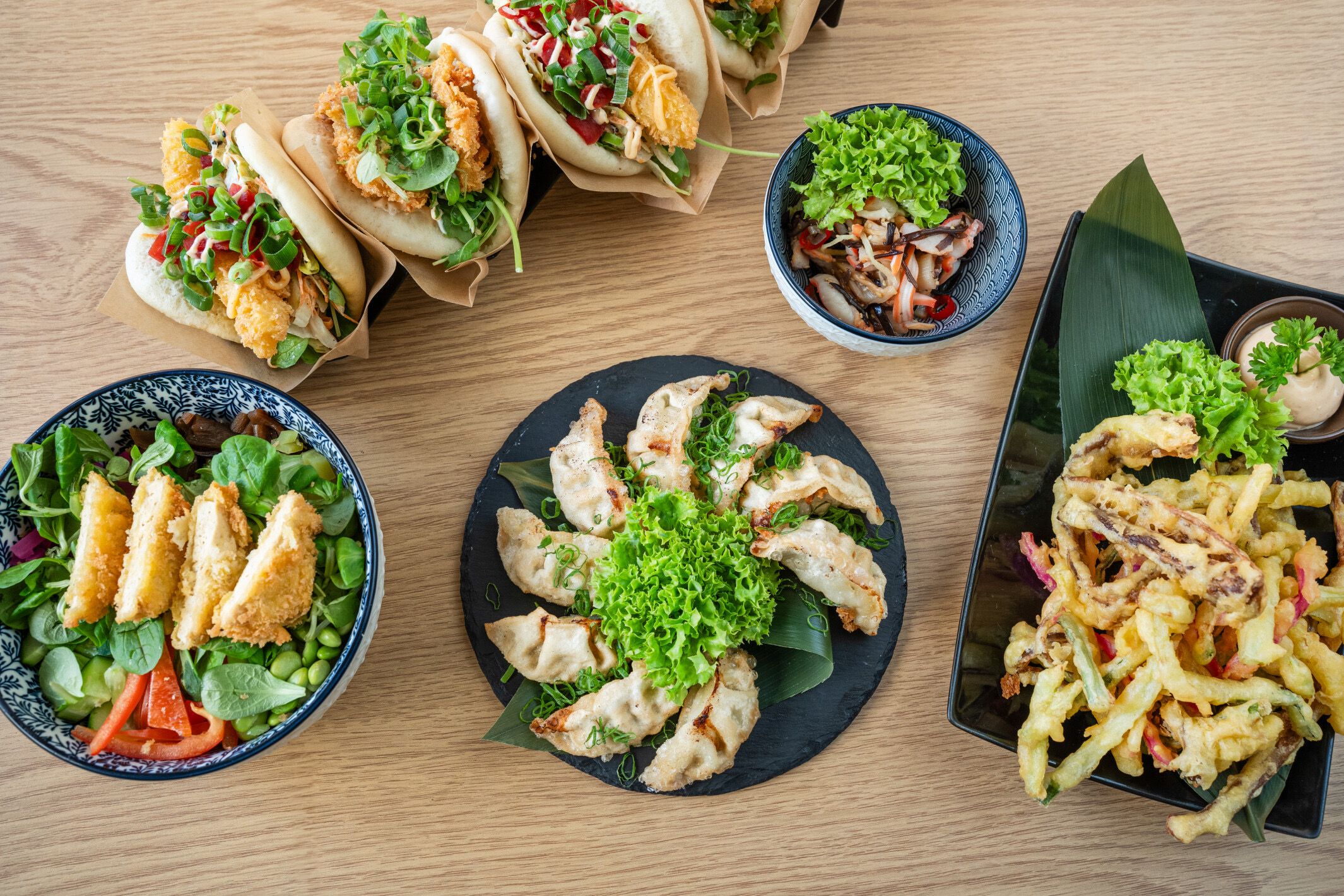 Ryż, sos do wyboru, kanpyo, papryka, edamame, ogórek, oshinko, tempeh w panko, roszponka