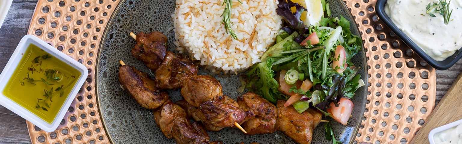 szaszłyk karkówka 2 szt., szaszłyk kurczak 2 szt., Lula Kebab wieprzowo-wołowy 2 szt., żeberko, szaszłyk ziemniak-boczek 2 szt. sos czosnkowy, sos satsebeli, sos barbecue