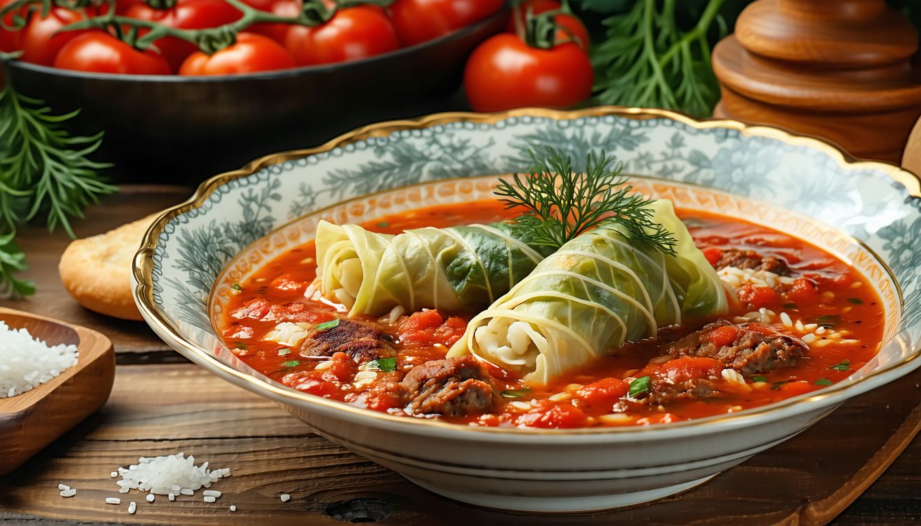 Roladki z liści kapusty nadziewane farszem, podawane z sosem. Zdjęcie poglądowe