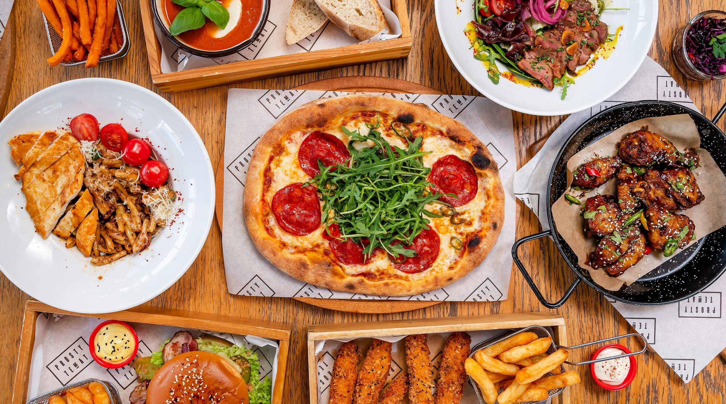 chrupiące pinsa, pulled beef w chipotle, mozzarella, powidła śliwkowe, czerwona cebula marynowana