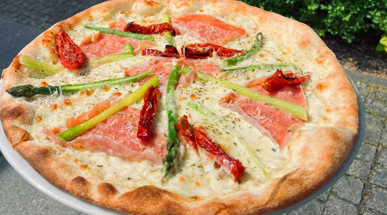 pikantny sos pomidorowy / mozzarella / guanciale / salami spianata / mascarpone / czerwona cebula