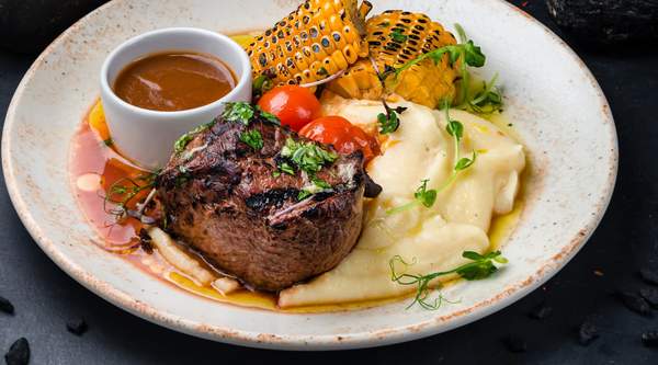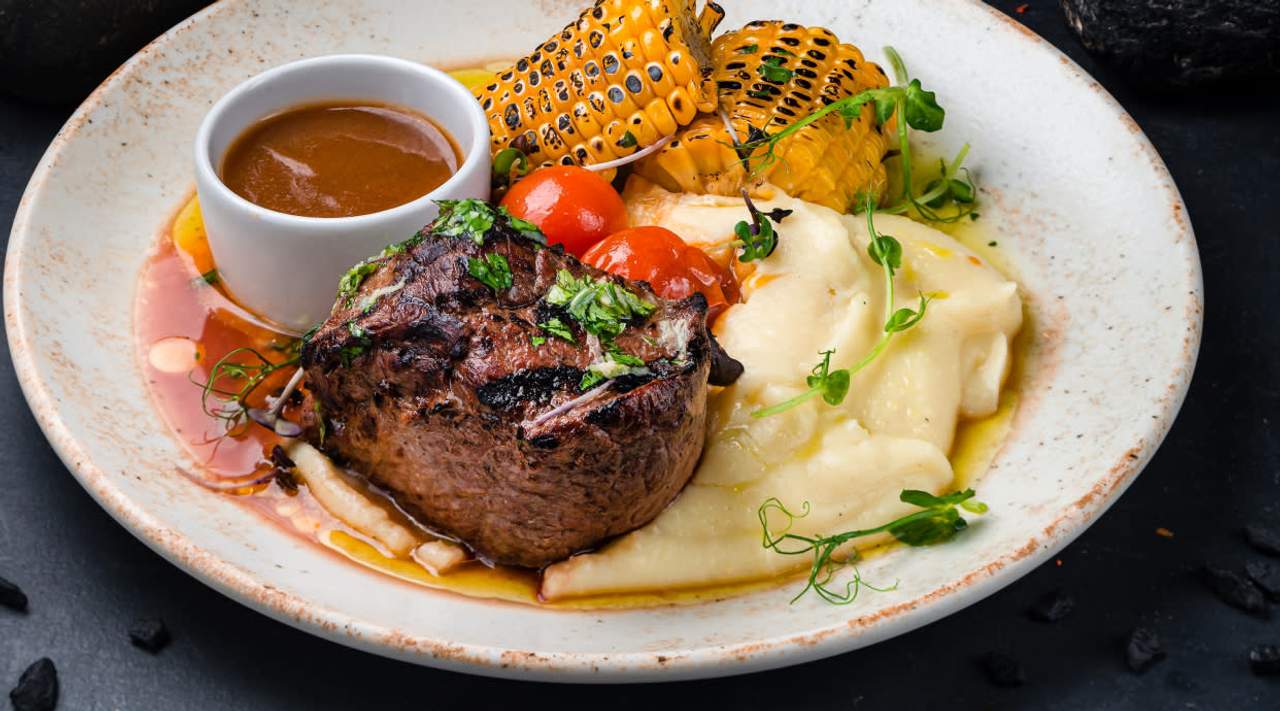 wołowina klasy limousine 180g / maślana bułka / sałata / pomidor / ogórek konserwowy / cebula czerwona / sos z karmelizowaną cebulką i piklami