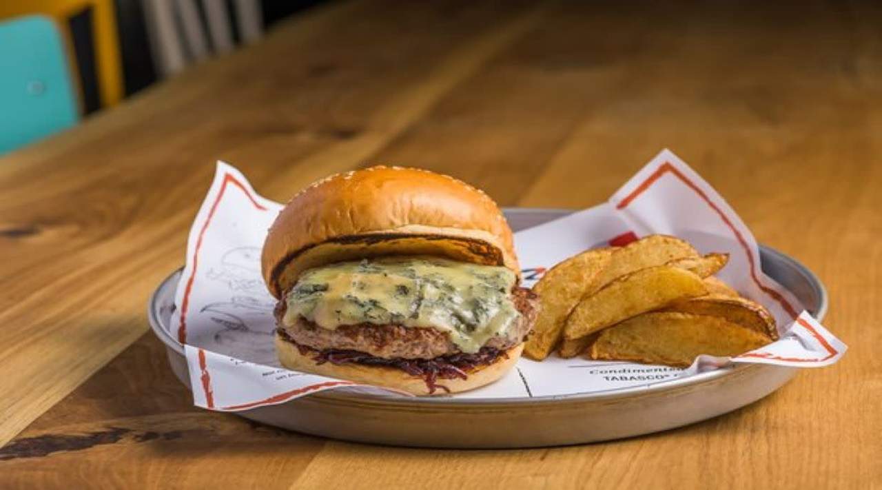 Kotlet z wolowiny dojrzewajacej (ze 180 g surowego miesa), bulka z sezamem, sos majonezowy, rukola, pomidor, ogorki konserwowe, cebula czerwona, sos Bbq, roszponka