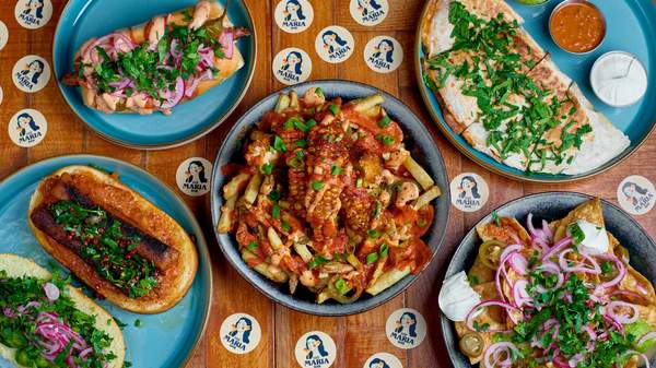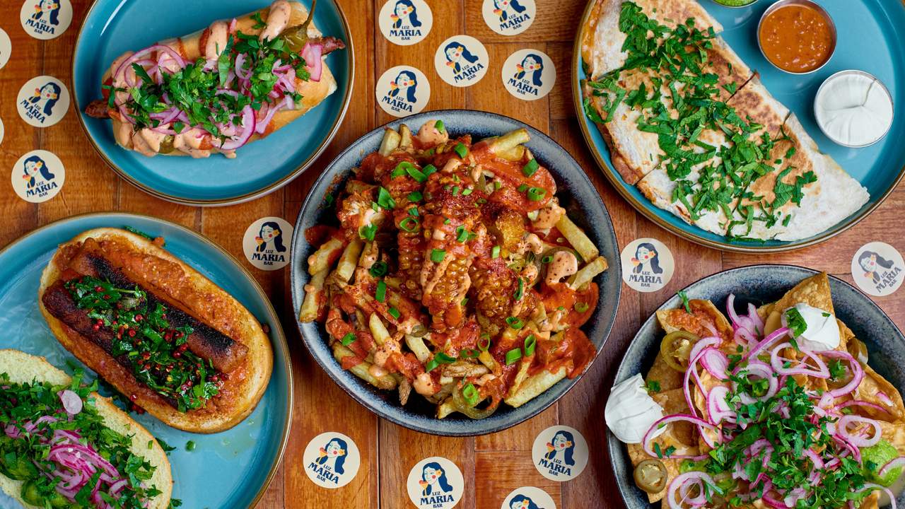 Frytki z kiszonego ziemniaka, sos serowy, złota kukurydza, tajin, jalapeño, sos Maria Rosa, szczypiorek