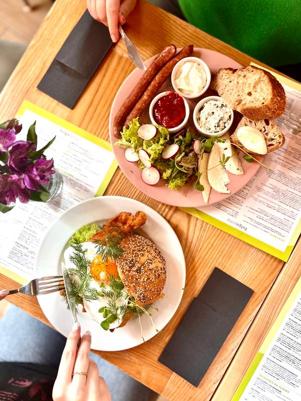 chleb na zakwasie / sos z chrzanem i piklami / kapusta kiszona / czerwona kapusta? / mozzarella / ser dojrzewający z Serotoniny