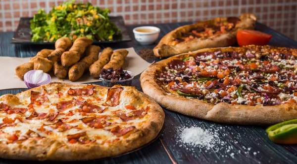 Tomate, natas, carne, cebola, pimentos e queijo mozzarella.