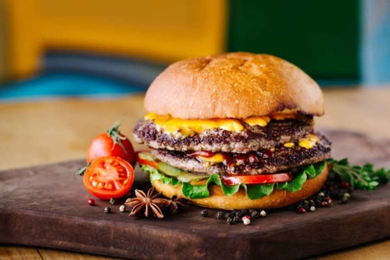 Pão, hambúrguer 180g, alface, tomate, queijo cheddar, fiambre, onion rings, cebola crocante, ovo, ketchup, e maionese.