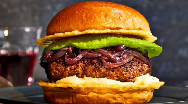 Pão de brioche, carne de vaca, cheddar, cebola caramelizada, alface iceberg, molho da casa