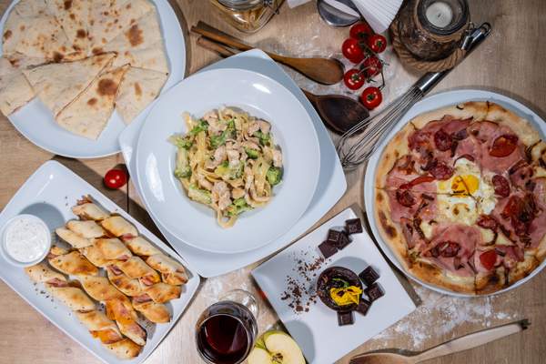 Aluat de pizza, sos de pizza, mozzarella, salam, șuncă, ciuperci, măsline, ardei gras, porumb – 550g