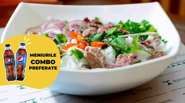 Noodles cu pui (sau legume), salată si suc doză (pepsi, mirinda sau 7 up)