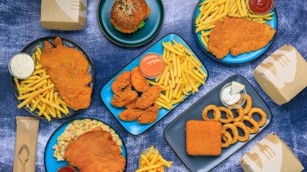 2 bucati Crispy, 1 bucata cascaval pane, cartofi prajiti 160g, sos la alegere 60g