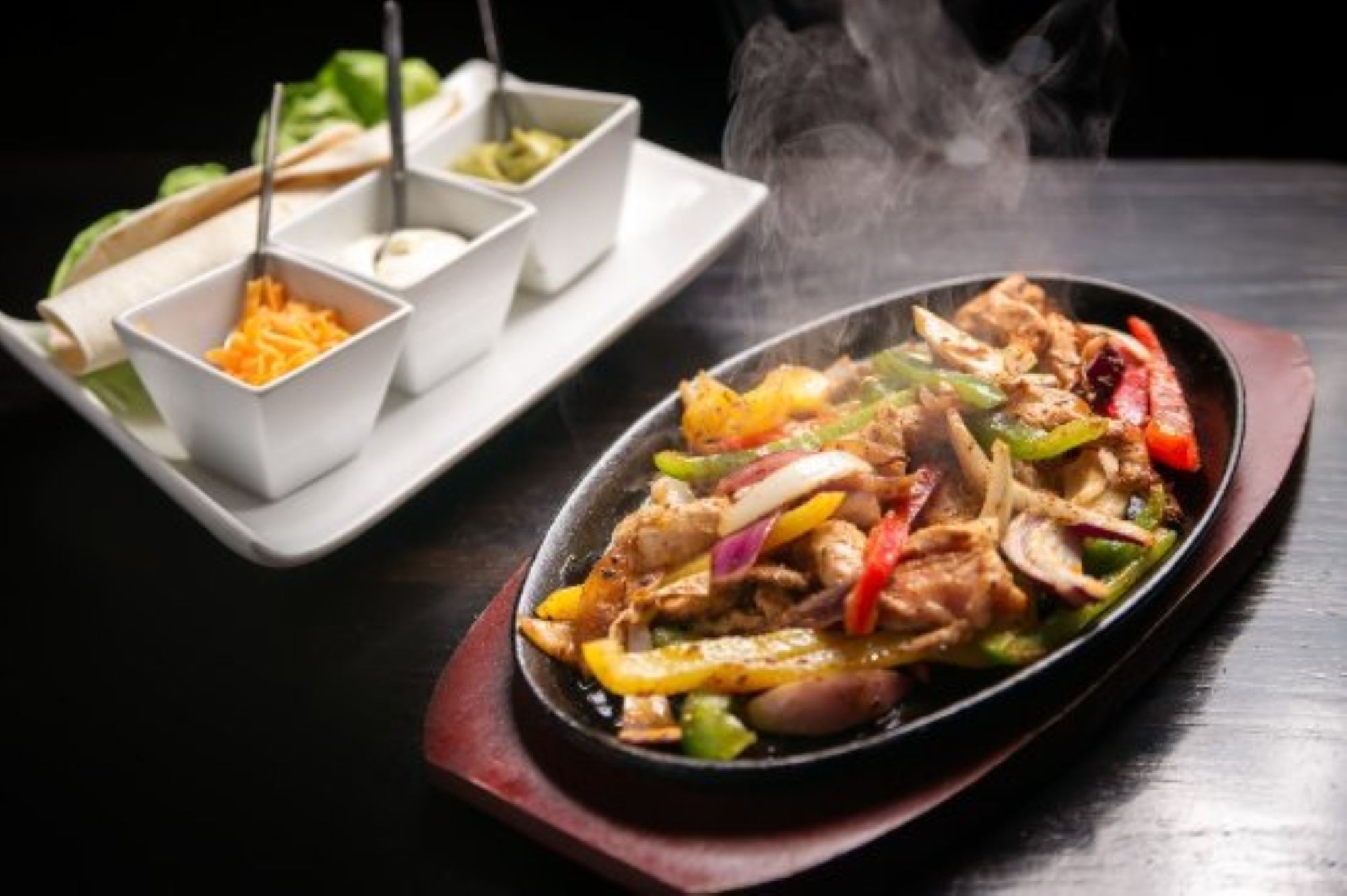 Specialitate mexicană din carne de pui, trasă la tigaie cu legume, servită pe platou încins cu sos salsa, guacamole, mozzarella, smântână și ardei jalapenos, servit cu tortilla - 350g