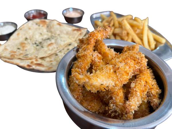 200g/280g bucatele de piept de pui special, prăjit la aer cald, cartofi prăjiți, pâine naan cu usturoi și unt, sos – 530g / 710g