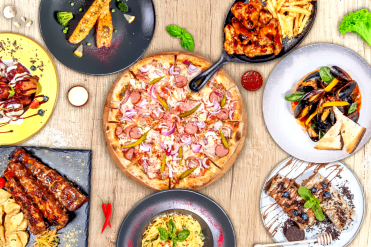 Sos de rosii, mozzarella, sunca, piept de pui, porumb, masline, oregano