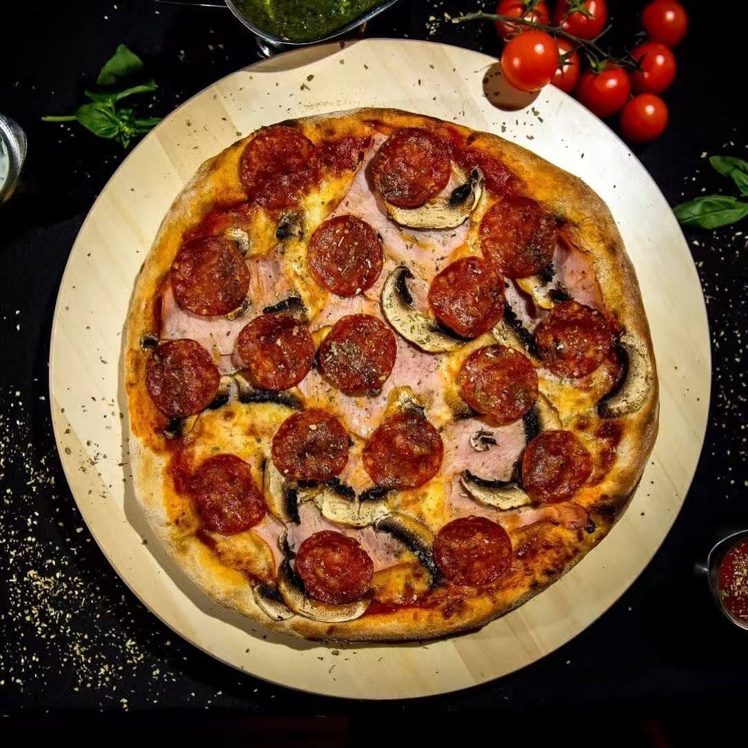 Sos roșii, mozzarella, sunca gustavo, salam chorizo, ciuperci, oregano - 760g