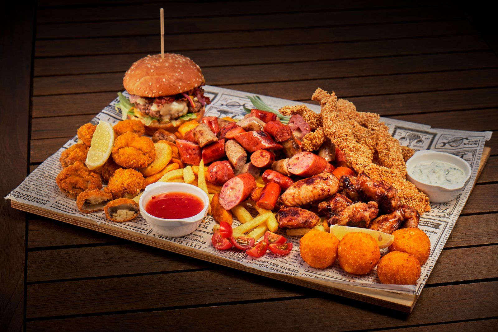 Svinjsko meso, kačkavalj, coleslaw salata, luk, suve šljive, jalapeno, krastavčići, hrskavi luk, bbq sos senf