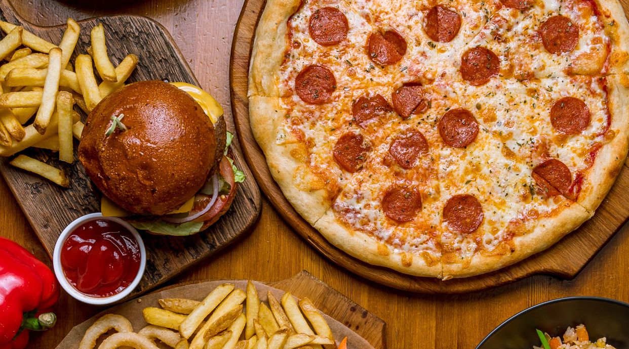 Sauce tomate, jambon de dinde, fromage, olives, frite