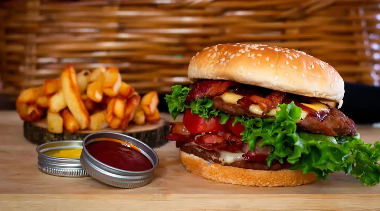 Дві соковиті котлети з яловичини, обгорнуті ароматним беконом, тостовий сир, хрусткий мікс салату, в’ялені томати та сирний соус. Подається з картоплею по-селянськи та кетчупом 563 г (443/80/40)