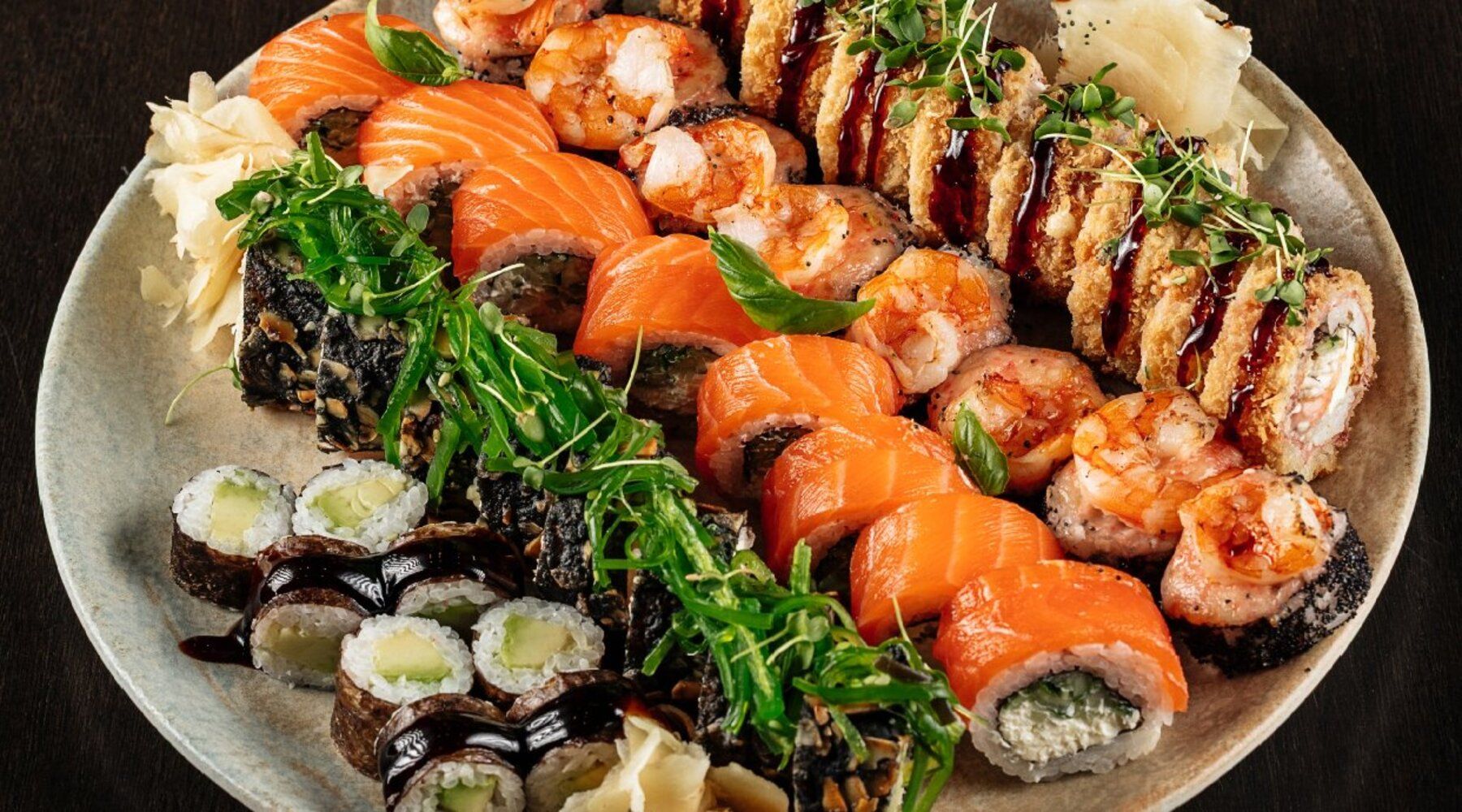 Філадельфія дабл лососьЗапечений з креветкоюХот рол з вугремТемпура з лососем в чорному клярі та мигдальними пластівцямиМакі з авокадо