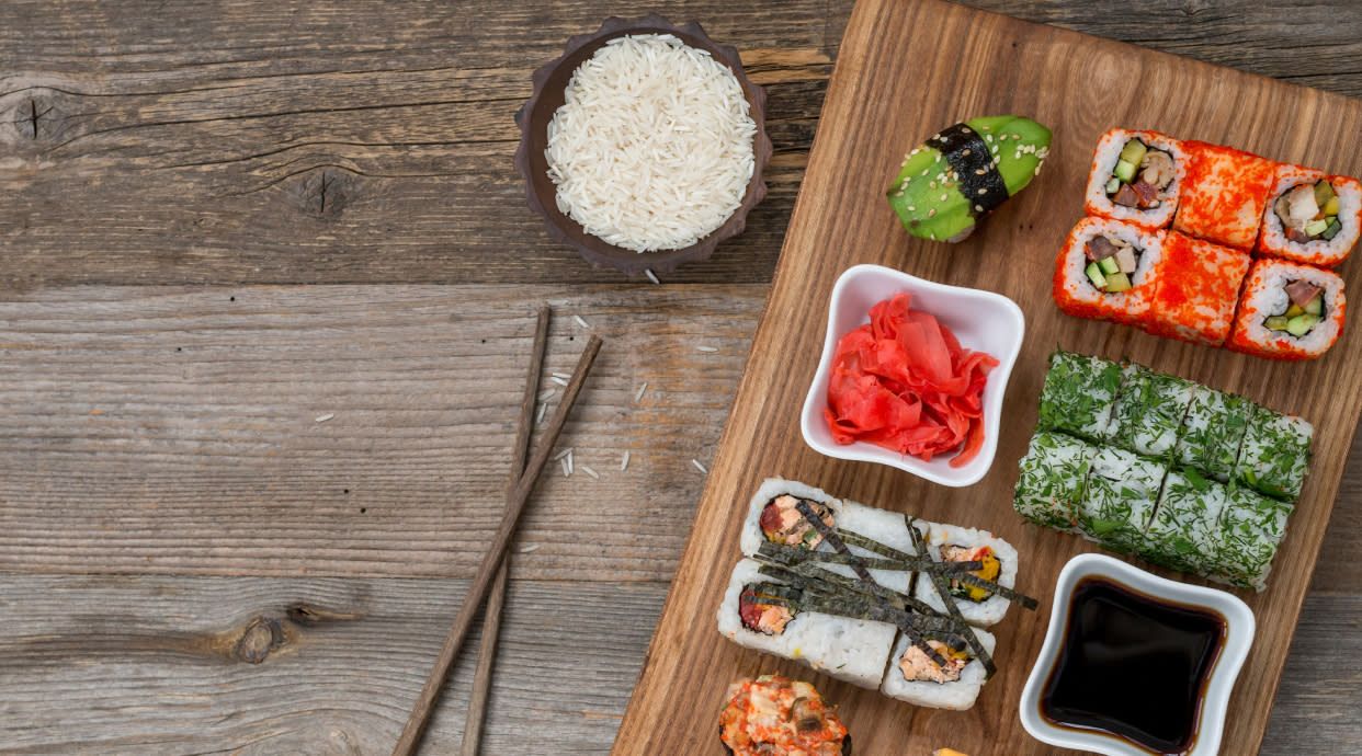 Рис, норі, крем-сир, вугор, соус Спайсі, авокада, лосось слабосолений, ікра Тобіко