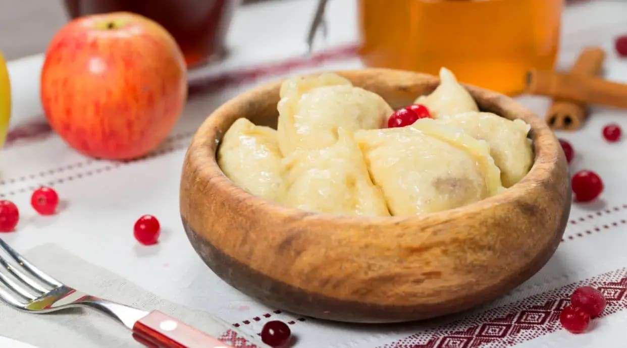 Вареники з тіста на основі домашнього сиру, з начинкою з вишні та цукру. Поливаються вершковим маслом та вишневим конфітюром(містить алкоголь). ( попадання кісточок)